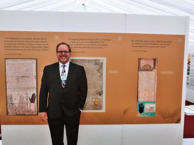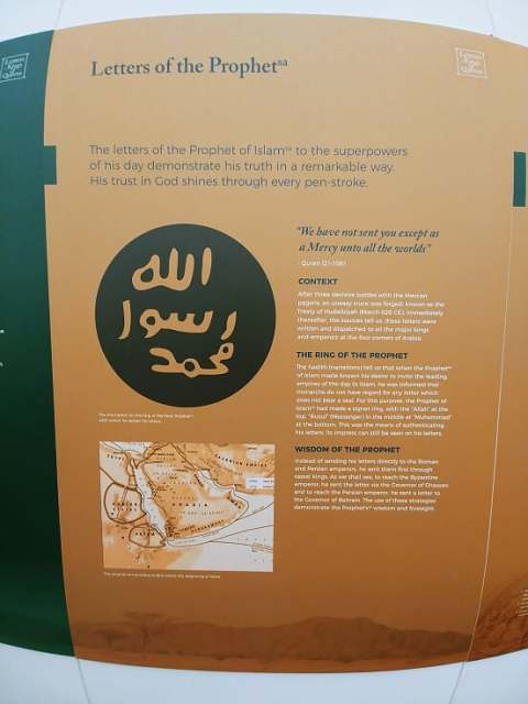 También se presta especial atención a la Alianza con los Monjes del Monasterio de Santa Catalina, examinándose el contexto histórico y las copias que se conservan. Todo un panel, dedicado a cuestiones de autenticidad, desacredita definitivamente las afirmaciones de que se trataba de una invención cristiana. Se estableció que el documento fue autentificado a través de los siglos, confirmado en fuentes islámicas primitivas, atestiguado por prominentes Compañeros del Profeta y fechado correctamente. Y para rematar, la exposición incluye réplicas a tamaño completo de varios pactos del Profeta (con los cristianos) de Creta, del Monasterio de Santa Catalina y del Monasterio de Simonos Petra.